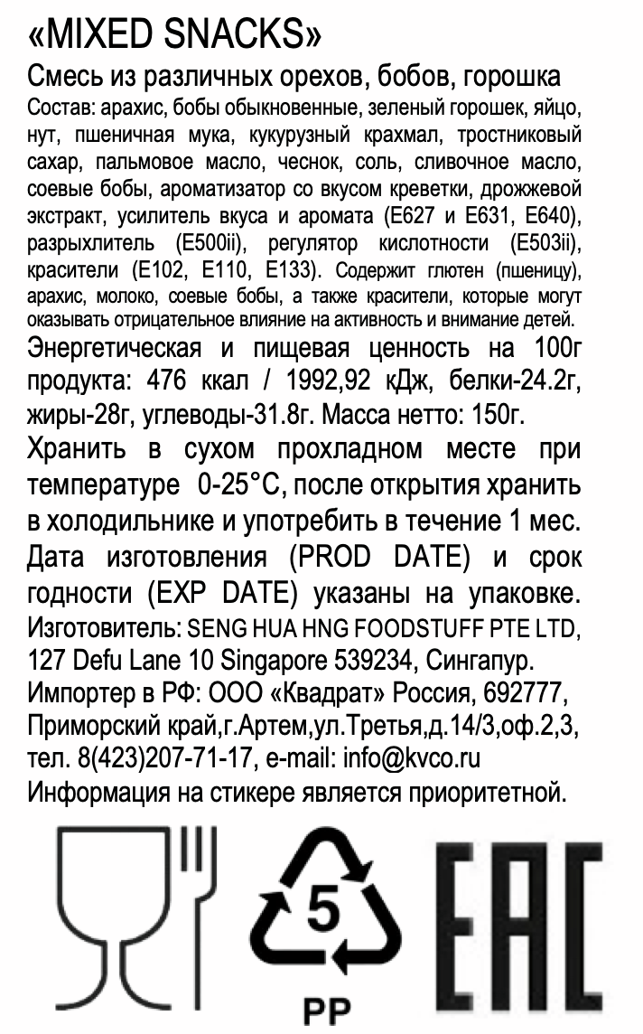 Арахис, бобы, горох, зеленый горошек, яйцо, пшеничная мука, кукурузный крахмал, пальмовое масло, тростниковый сахар, модицицированный крахмал тапиоки, ароматизатор рыбы, чеснок, соль, масло, соевые бобы, гидролизированный растительный протеин, лук, дрожжевой экстракт, ароматизатор (Е621,Е627,Е631,Е640), агент повышения (Е900II, E903II), окраска (Е102,Е110,Е133,Е180d). Содержит глютен (пшеницу), арахис, молоко и соевые бобы.