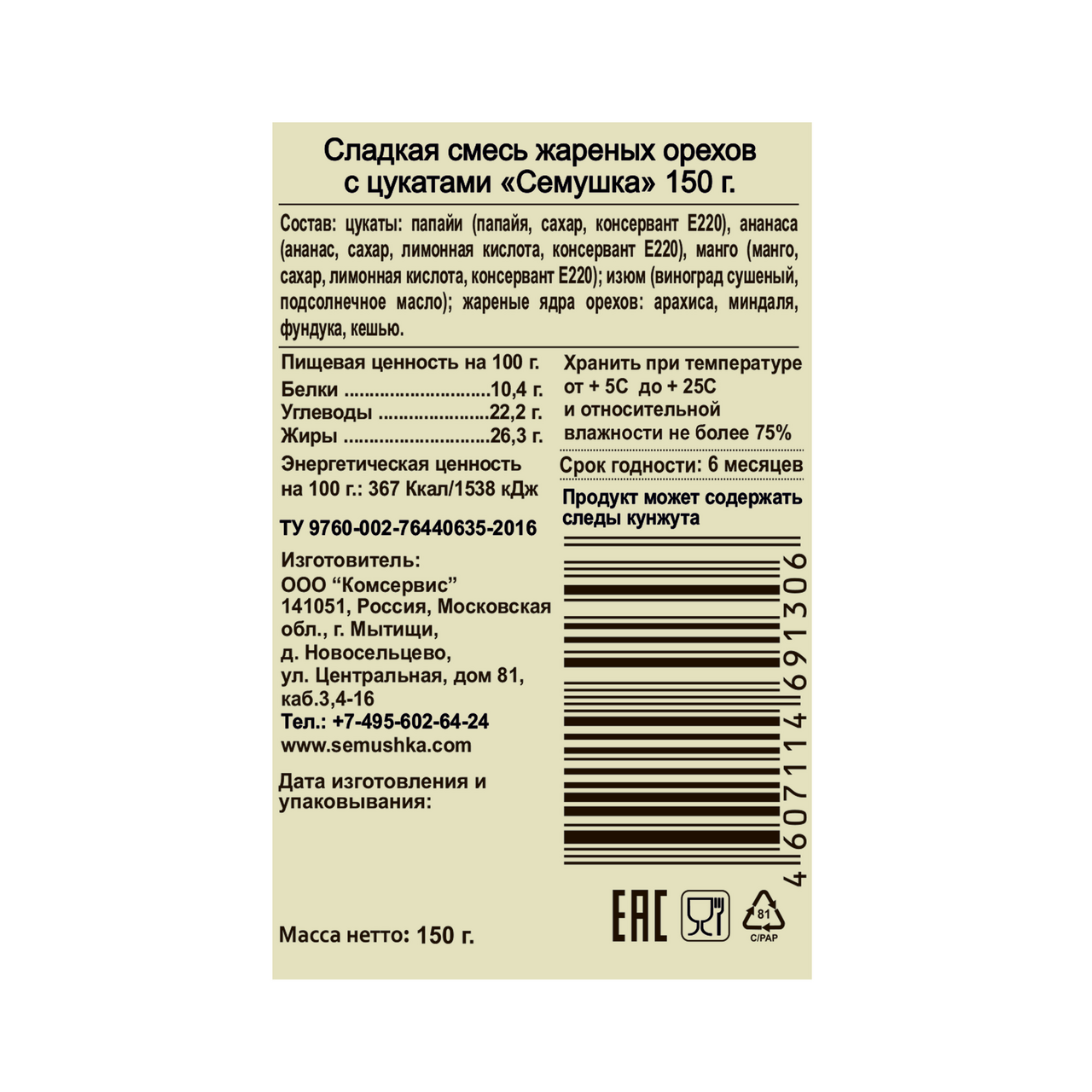 Смесь Семушка жареных орехов сладкая с цукатами, 150г