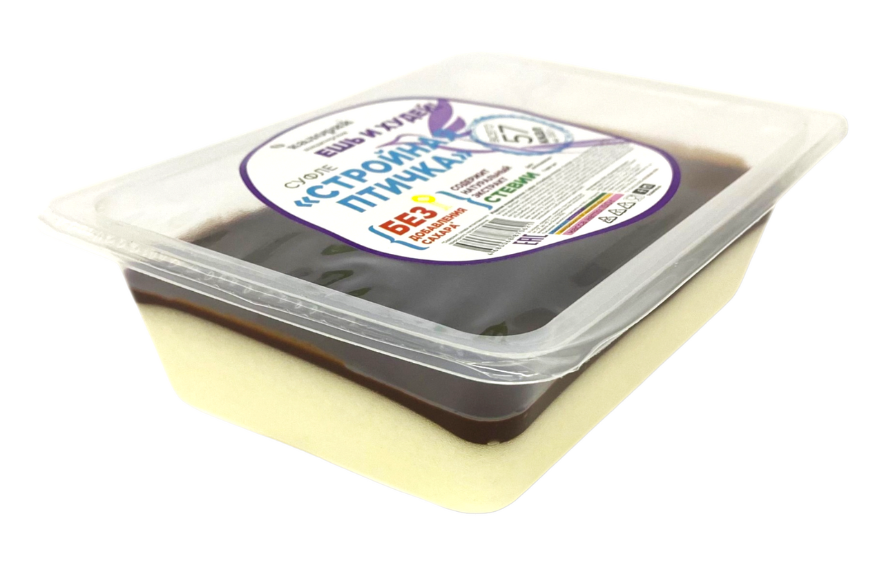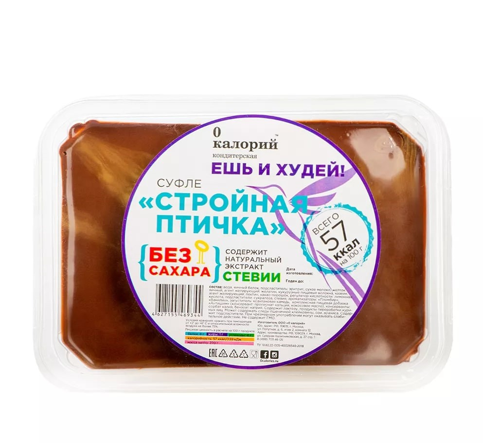 Нежнейший десерт Стройная птичка - это сбалансированное сочетание нежнейшего ванильного суфле с глазурью из шоколада, подарит невероятное удовольствие любителям сладкого без вреда для фигуры, ведь наша птичка не содержит сахара и имеет ультранизкую калорийность.