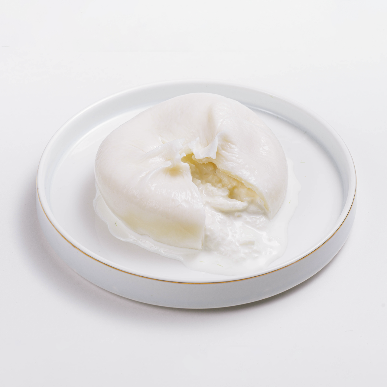Самостоятельный деликатес. Шелковистый сырный мешочек из моцареллы, наполненный тончайшими сырными нитями - страчателлой. Очень необычное и аутентичное блюдо из Италии.