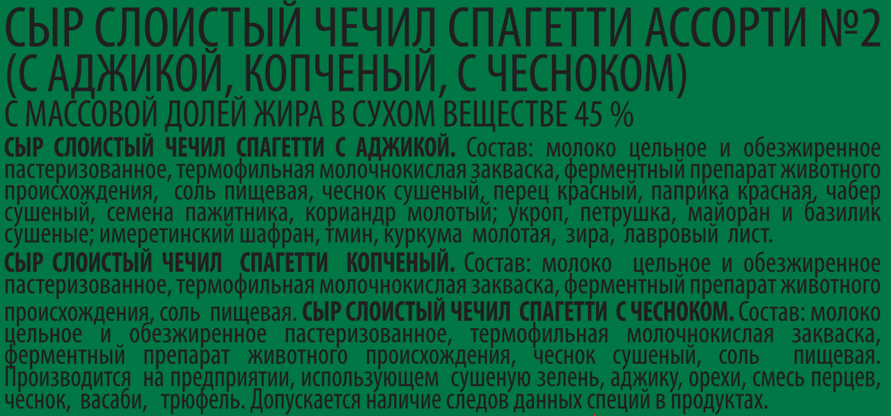 сушеные, имеретинский шафран, тмин, куркума молотая, зира, лавровый лист. Сыр слоистый чечил спагетти копченый: молоко цельное и обезжиренное пастеризованное, термофильная молочнокислая закваска, ферментный препарат животного происхождения, соль пищевая. Сыр слоистый чечил спагетти с чесноком: молоко цельное и обезжиренное пастеризованное, термофильная молочнокислая закваска, ферментный препарат животного происхождения, чеснок сушеный, соль пищевая.