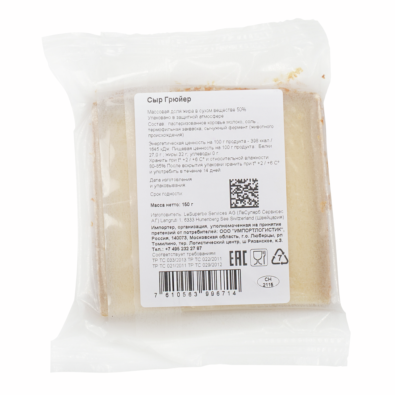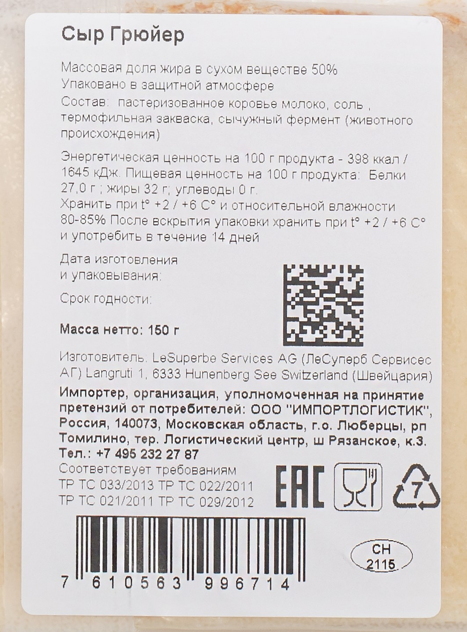 Это твердый сыр цвета слоновой кости, с небольшими дырочками. Отличается фруктовым, слегка солоноватым вкусом (в процессе созревания головки Грюйера периодически переворачивают и обмывают соленой водой). Период созревания 5 месяцев. Грюйер - главный компонент фондю, но кроме этого, он очень вкусен на тостах, в слегка расплавленном виде. Эксклюзивный швейцарский сыр, история которого началась в далеком 1115 году в деревушке Грюйер на западе Швейцарии. Производится из натурального молока без добавления искусственных компонентов и созревает не менее 6 месяцев. Обладает пряно-фруктовым, в меру солоноватым вкусом и неповторимым пикантным ароматом. Имеет плотную, однородную структуру без глазков. Грюйер отлично подойдет для бутербродов, сэндвичей, горячих блюд и выпечки, а также для фондю. Сыр уже аккуратно нарезан тонкими ломтиками и полностью готов к подаче. Гармонично сочетается с красным вином, фруктами и орехами. Вакуумная упаковка надежно сохраняет его свежесть и вкусовые свойства в пределах всего срока годности.