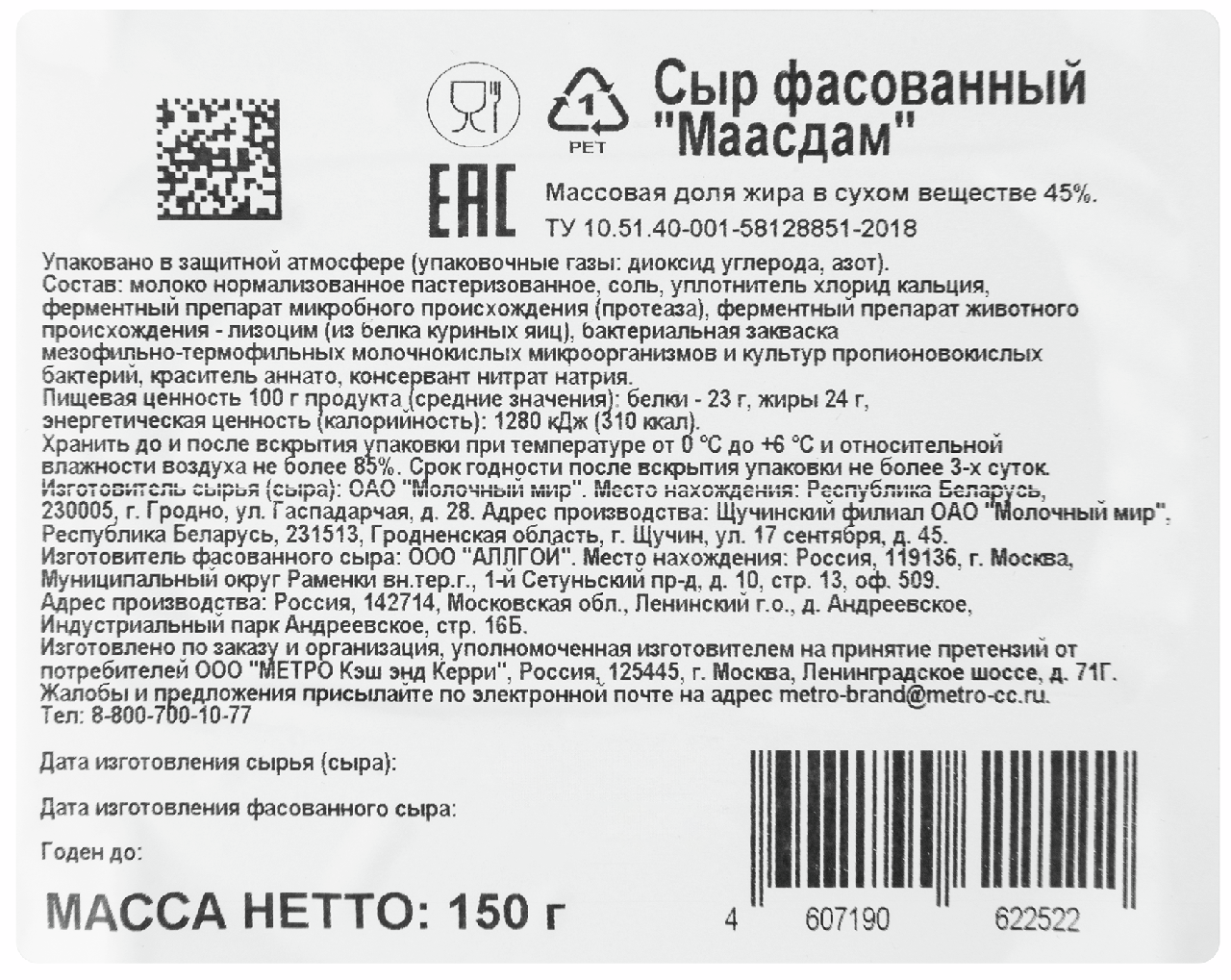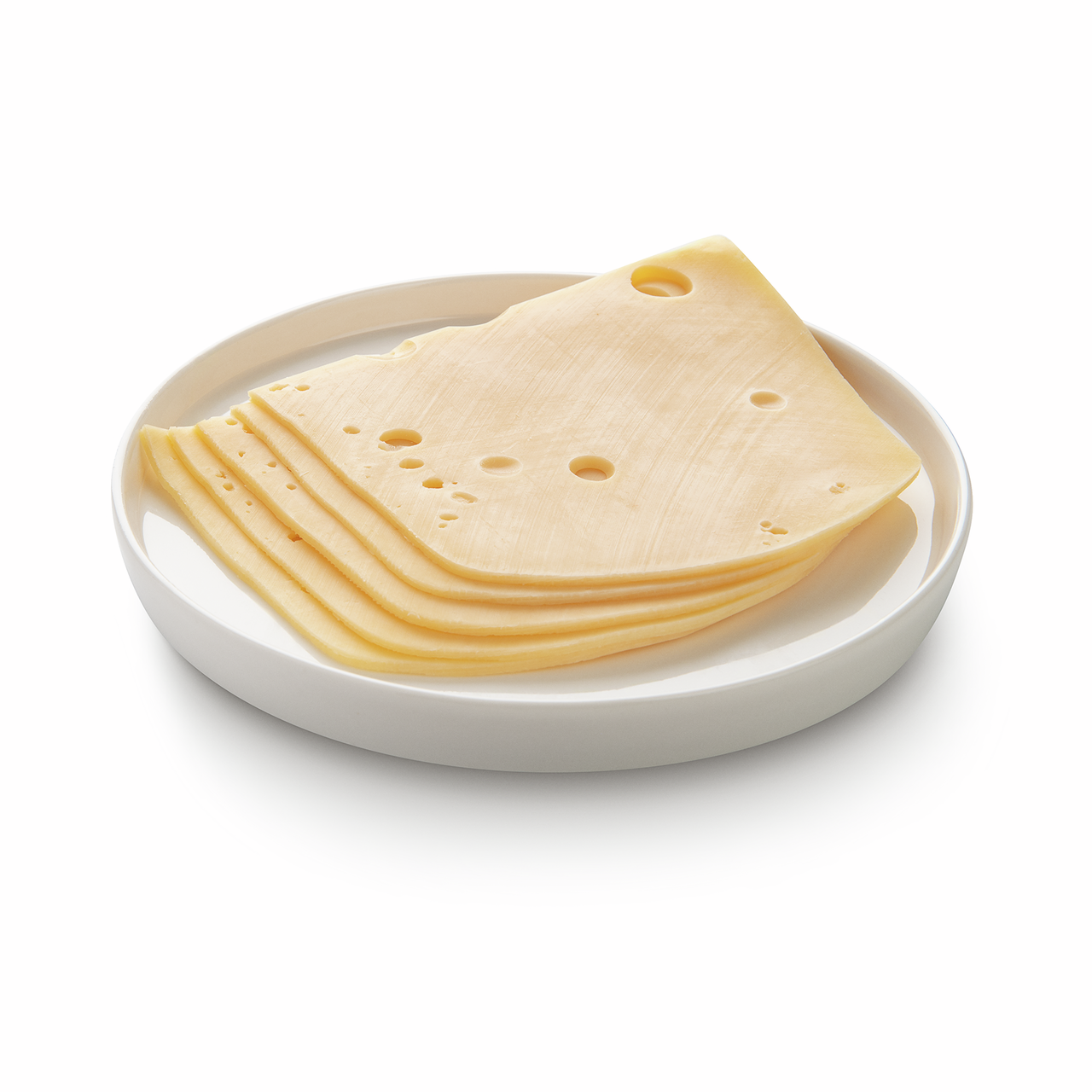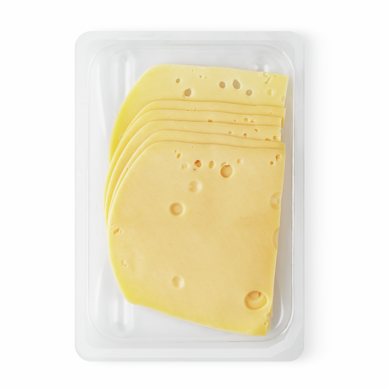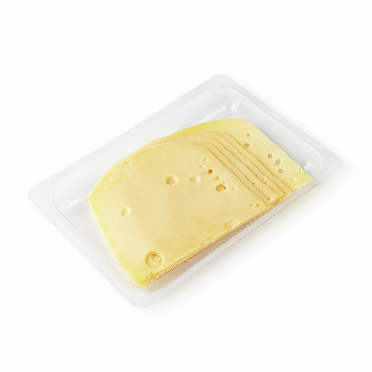 Сыр полутвердый фасованный Маасдам в нарезке Fine Life, массовая доля жира в сухом веществе 45%, Россия. Готов к употреблению.