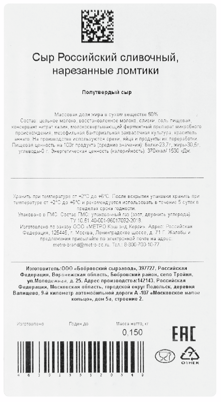 Metro Chef Сыр российский нарезка 50%, 150г имеет высокие органолептические показатели: умеренный сливочный вкус и нежный аромат, пластичную и однородную консистенцию, светло-желтый цвет. На разрезе сыр имеет ажурный рисунок, который состоит из глазков неправильной и угловатой формы. Изготовление сыра производится по технологическим регламентам с использованием только натуральных ингредиентов. В кулинарии этот продукт рекомендуют сочетать с медом и употреблять как изысканный десерт, а также его используют для приготовления основных блюд и салатов.