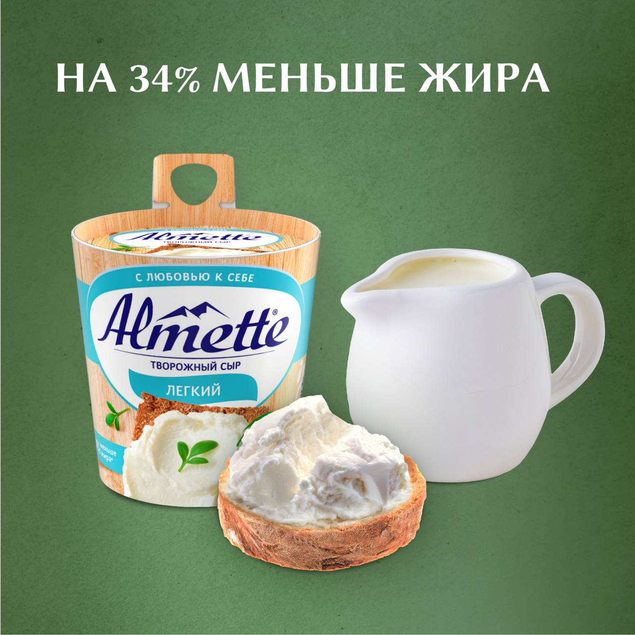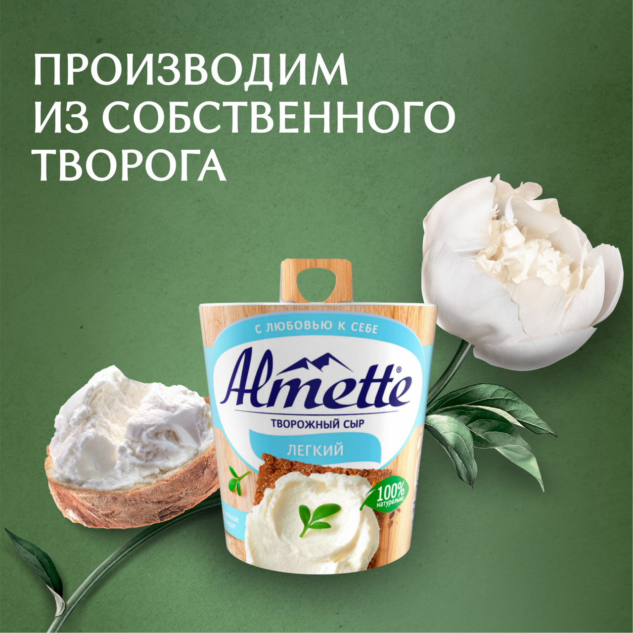 Творожный сыр Almette легкий — это идеальный выбор для тех, кому важны вкус, натуральность и легкость, а также способ испытать гастрономическое удовольствие и проявить любовь к себе. В нем на 34% меньше жира*, но при этом 100% натуральный творожный сыр сохраняет свою бархатистую текстуру и сливочный вкус. Альметте легкий станет отличным дополнением к вашим любимым закускам. Попробуйте творожный сыр на багете или круассане на завтрак, используйте для брускетт или канапе. Или просто возьмите ложку и побалуйте себя перекусом, ведь сыр Almette легкий можно есть без каких либо дополнений, наслаждаясь его нежным сбалансированным вкусом.*по сравнению со средним значением содержания жира в 100 г продукта Альметте Сливочный.
