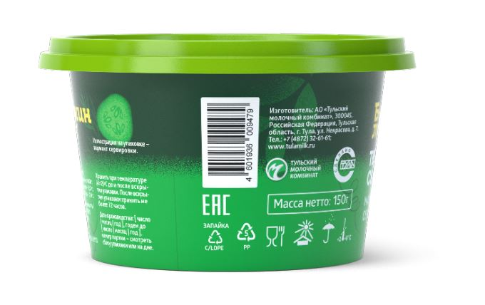 Творог (молоко цельное, молоко обезжиренное, закваска молочнокислых микроорганизмов), сливки, наполнитель (патока кукурузная; огурцы маринованные (огурцы, соль, сахар, регулятор кислотности уксусная кислота, укроп, петрушка, перец черный); вода; укроп сушеный; соль; загустители: дикрахмалфосфат оксипропиллированный, пектины; регулятор кислотности уксусная кислота; чеснок сушеный; ароматизатор), комплексная пищевая добавка (сывороточный белковый концентрат; стабилизаторы: карбоксиметилцеллюлоза, каррагинан; загуститель камедь рожкового дерева), соль.