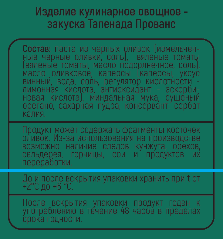 Паста из черных оливок, вяленые томаты, оливковое масло, каперсы, миндальная мука, сушёный орегано, сахарная пудра, консервант: сорбат калия.