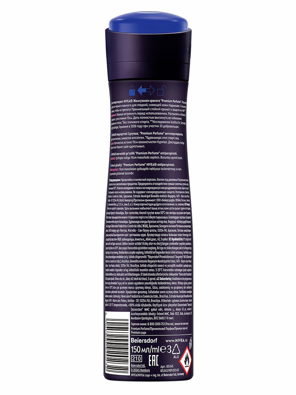 Дезодорант-антиперспирант спрей для женщин Nivea Жемчужная красота Premium Perfume, благодаря своей формуле с экстрактом черного жемчуга обеспечивает премиальный стойкий аромат и надёжную защиту от потоотделения и неприятного запаха на 48 часов. Для гладкой и сияющей кожи подмышек. Слишком красивых, чтобы их прятать! Дезодорант-антиперспирант быстро высыхает и защищает от неприятного запаха на 48 часов. Без ощущения липкости на коже. Дерматологически протестировано. Уже более 100 лет Nivea создает особенно бережные для кожи формулы. Попробуй нежный уход за кожей от антиперспиранта Nivea без этилового спирта! Применение: хорошо встряхнуть перед использованием. Распылять в области подмышек с расстояния 15-20 см. Дать полностью высохнуть во избежание образования пятен на одежде.