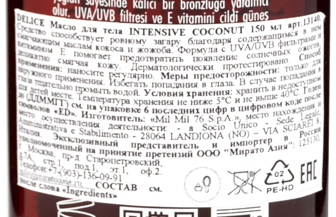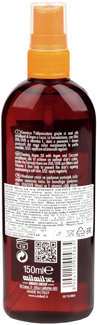 Масло для тела с экстрактом кокоса. Способствует ежедневной защите кожи от солнца, сохраняет загар, придает сияние и красоту коже. В формуле присутствуют UVA-UVB солнечные фильтры и витамин Е, которые помогают предотвратить старение кожи, делая ее мягкой. Водостойкий.