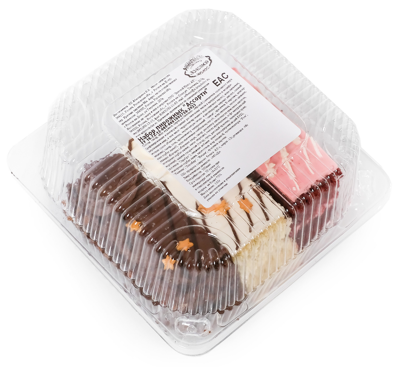 Набор пирожных состоящий из цветного, шоколадного и классического бисквита, вишневого, шоколадного и сливочный крем, кондитерский декор.