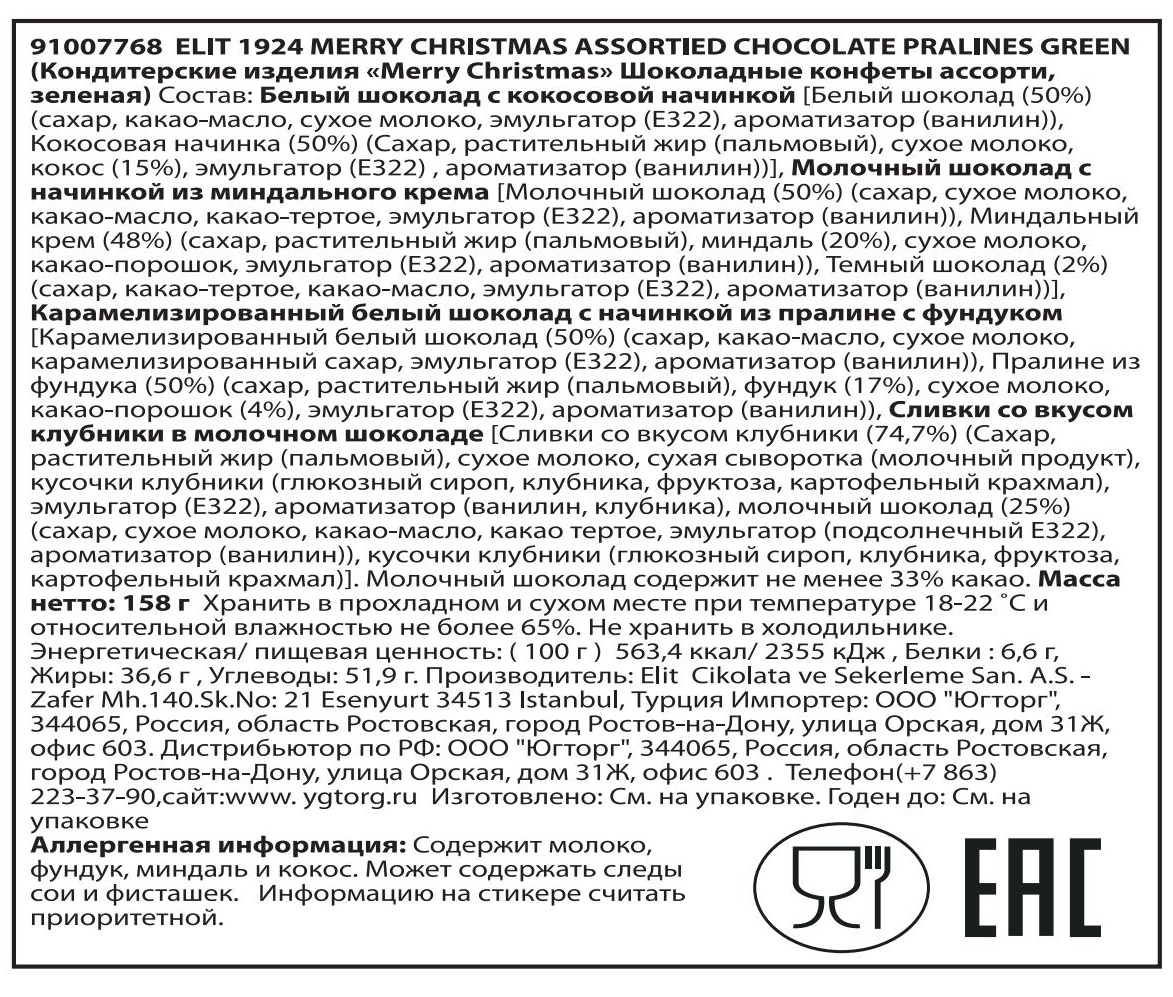 Сахар, сухое молоко, какао-масло, эмульгатор подсолнечный лецитин, ароматизатор ванилин; Сахар, растительный жир пальмовое масло, сухое молоко, кокос, эмульгатор подсолнечный лецитин, ароматизатор ванилин; Сахар, сухое молоко, какао масло, какао тертое, эмульгатор подсолнечный лецитин, ароматизатор ванилин;Сахар, растительный жир пальмовое масло, миндаль, сухое молоко, какао порошок, эмульгатор подсолнечный лецитин, ароматизатор ванилин; какао тертое, сахар, какао масло, эмульгатор подсолнечный лецитин,ароматизатор ванилин; Карамелизированный белый шоколад Сахар, какао масло, карамелизированный сахар, эмульгатор подсолнечный лецитин, ароматизатор ванилин; Сахар, растительный жир пальмовое масло, фундук, сухое молоко, какао-порошок, эмульгатор подсолнечный лецитин, ароматизатор ванилин; Сахар, растительный жир пальмовое масло, сухая сыворотка молочный продукт, кусочки клубники глюкозный сироп кукуруза, пшеница, вода, клубника, фруктоза, картофельный крахмал, эмульгатор подсолнечный лецитин, ароматизаторы ванилин, клубника; Сахар, сухое молоко, какао-масло, какао тертое, эмульгатор подсолнечный лецитин, ароматизатор ванилин; глюкозный сироп кукуруза, пшеница, вода, клубника, фруктоза, картофельный крахмал.