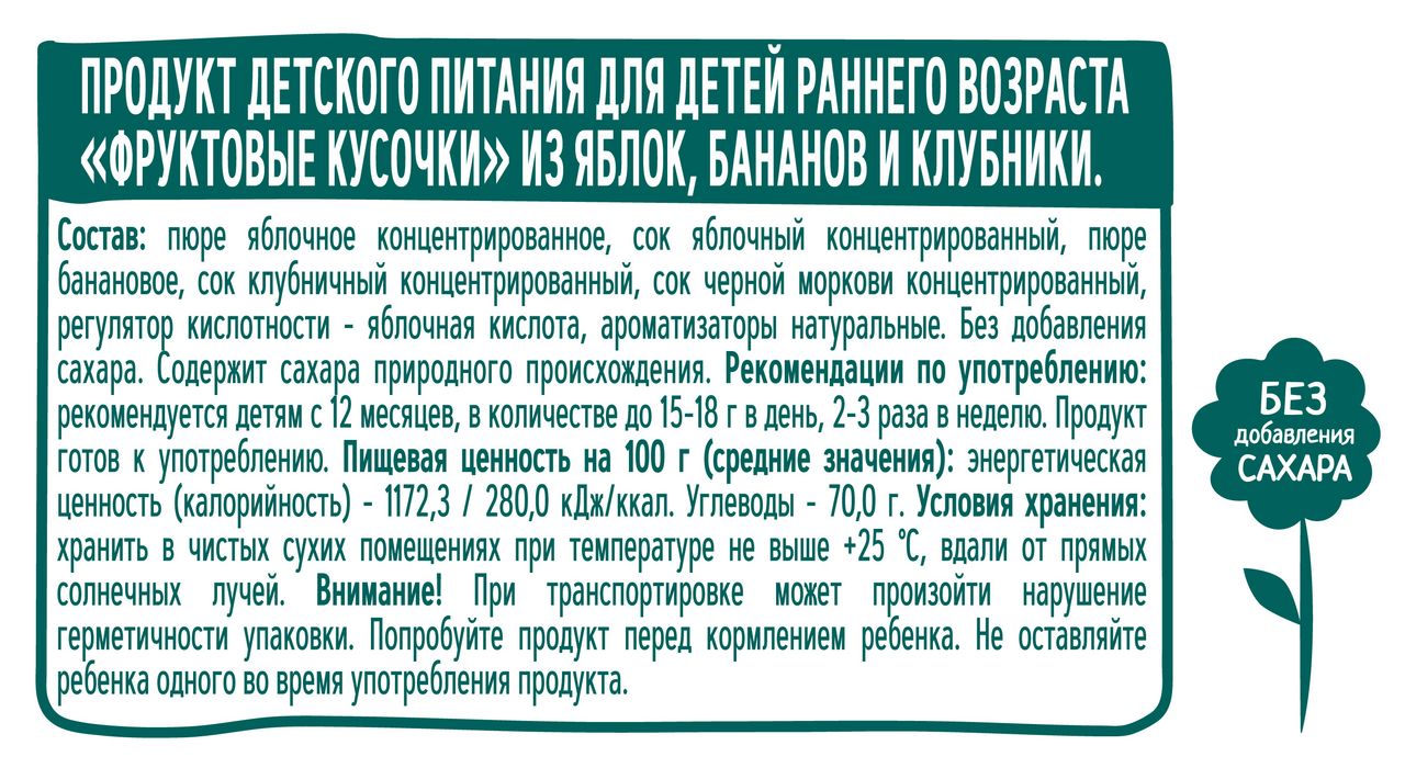 Пюре яблочное концентрированное, сок яблочный концентрированный, пюре банановое, сок клубничный концентрированный, сок черной моркови концентрированный, регулятор кислотности-яблочная кислота, ароматизаторы натуральные. Без добавления сахара. *Содержатся.