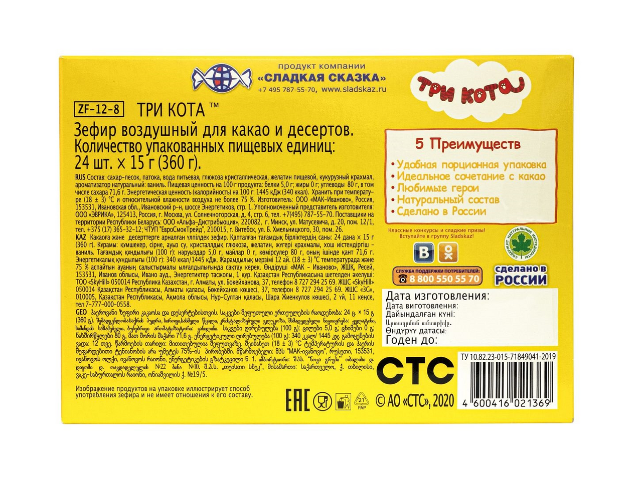 Зефир Зефирюшки Три кота воздушный для какао и десертов, 15г х 24 шт