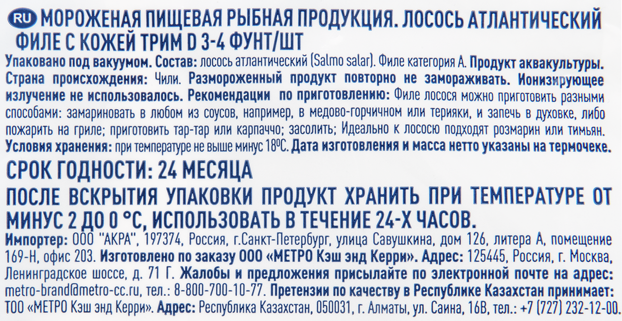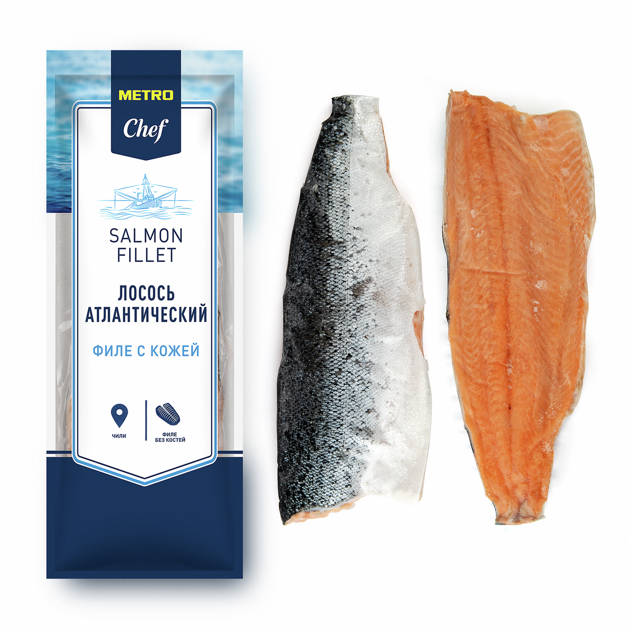 METRO Chef Филе лосося на коже Трим D замороженное, ~1.5кг - прекрасная основа для вкусных и полезных блюд. Рыбу можно запечь в духовке, пожарить, засолить, использовать как начинку для пирогов. Мясо уже очищено от костей, что упрощает процесс его приготовления. Лосось содержит кислоты Омега-3-6, необходимые для здоровья сосудов и красивой кожи, а также витамины группы В и другие полезные вещества. Рыбу особенно рекомендуется включать в диетический и лечебный рацион при проблемах с нервной системой.