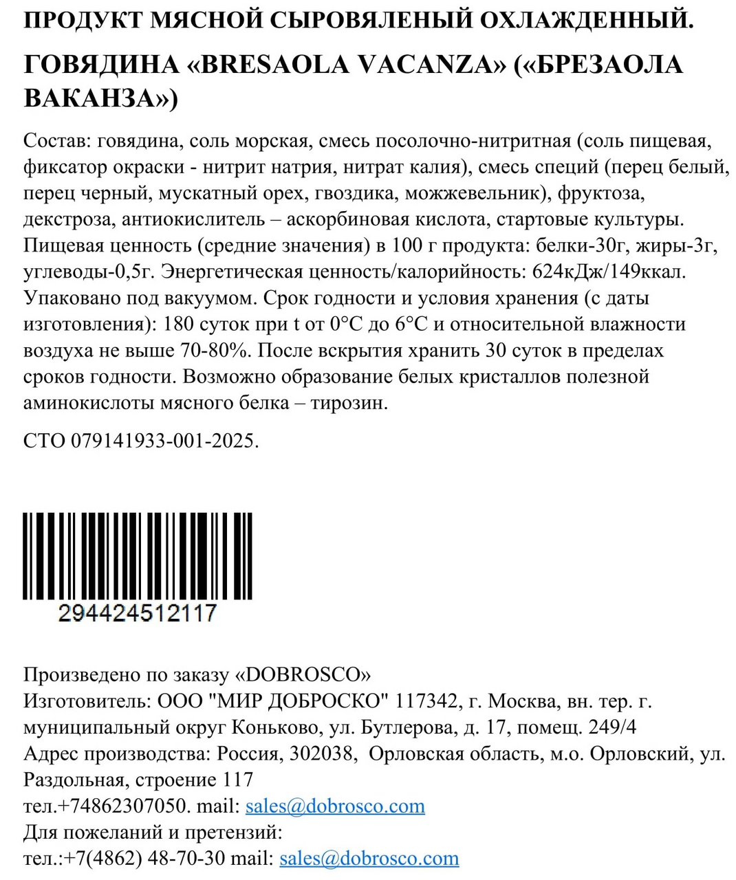 Говядина Dobrosco Bresaola Vacanza сыровяленая, ~1.5кг