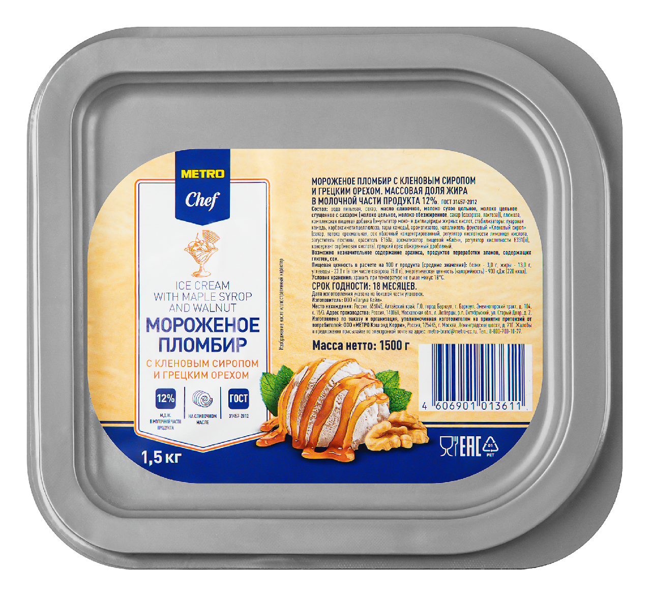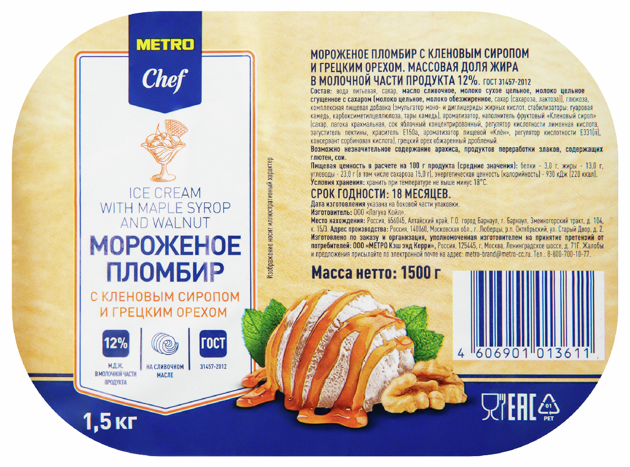 Мороженое пломбир METRO Chef с кленовым сиропом и грецким орехом сделан из настоящего сливочного масла, сгущенного молока с добавлением сиропа и обжаренного грецкого ореха. Произведено строго по ГОСТ.