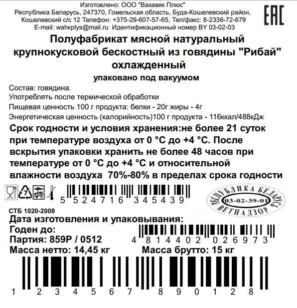 Рибай говяжий Вахавяк Плюс бескостный охлажденный, ~1.5кг