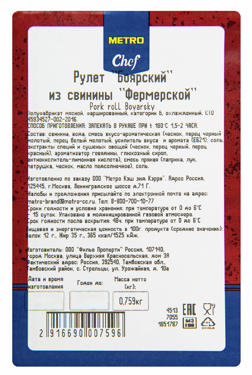 METRO Chef Рулет Боярский из фермерской свинины охлажденный, ~700г