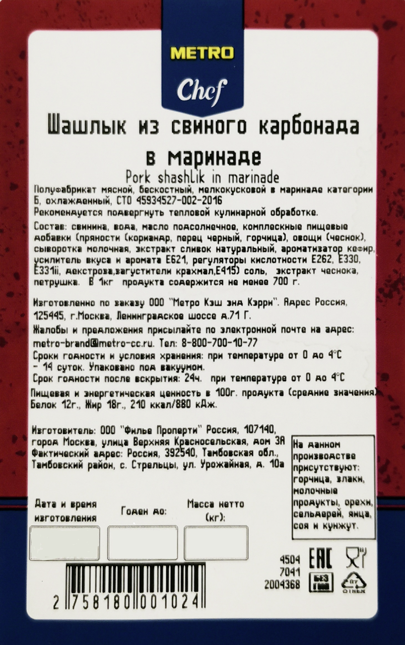 METRO Chef Шашлык из карбонада в маринаде, ~1.5кг