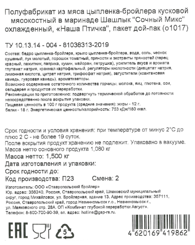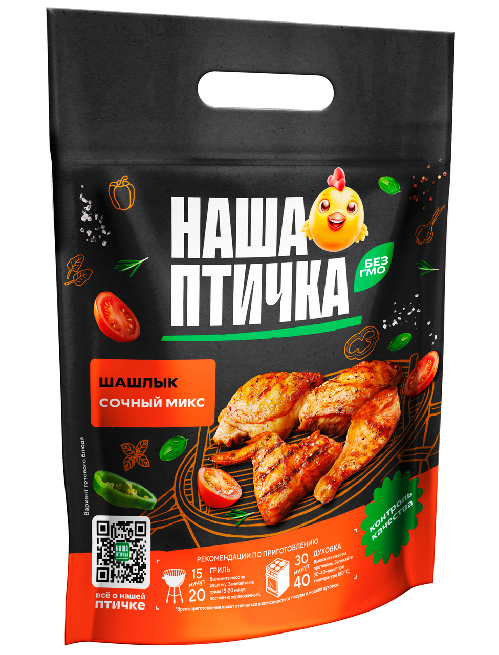 Шашлык из цыпленка-бройлера Наша птичка Сочный микс охлажденный, 1.5кг