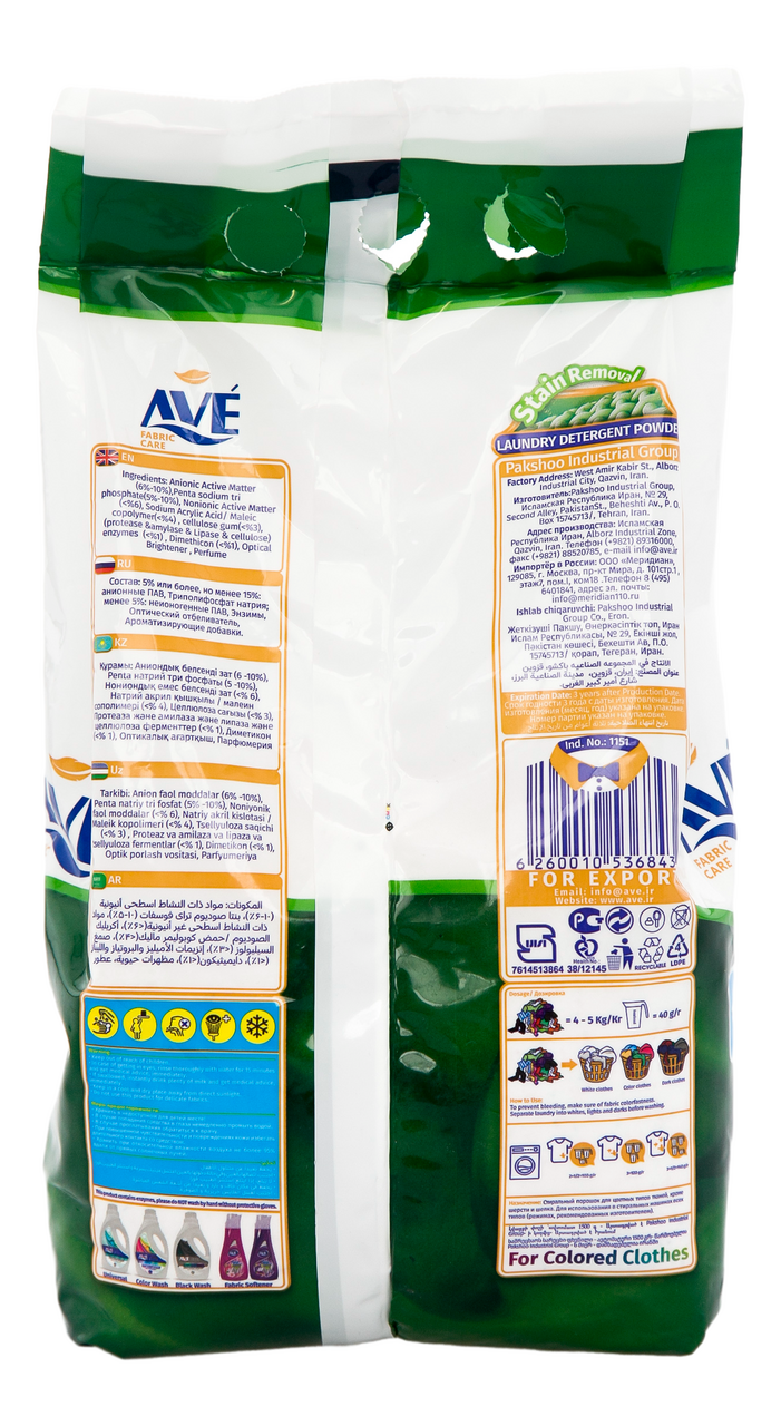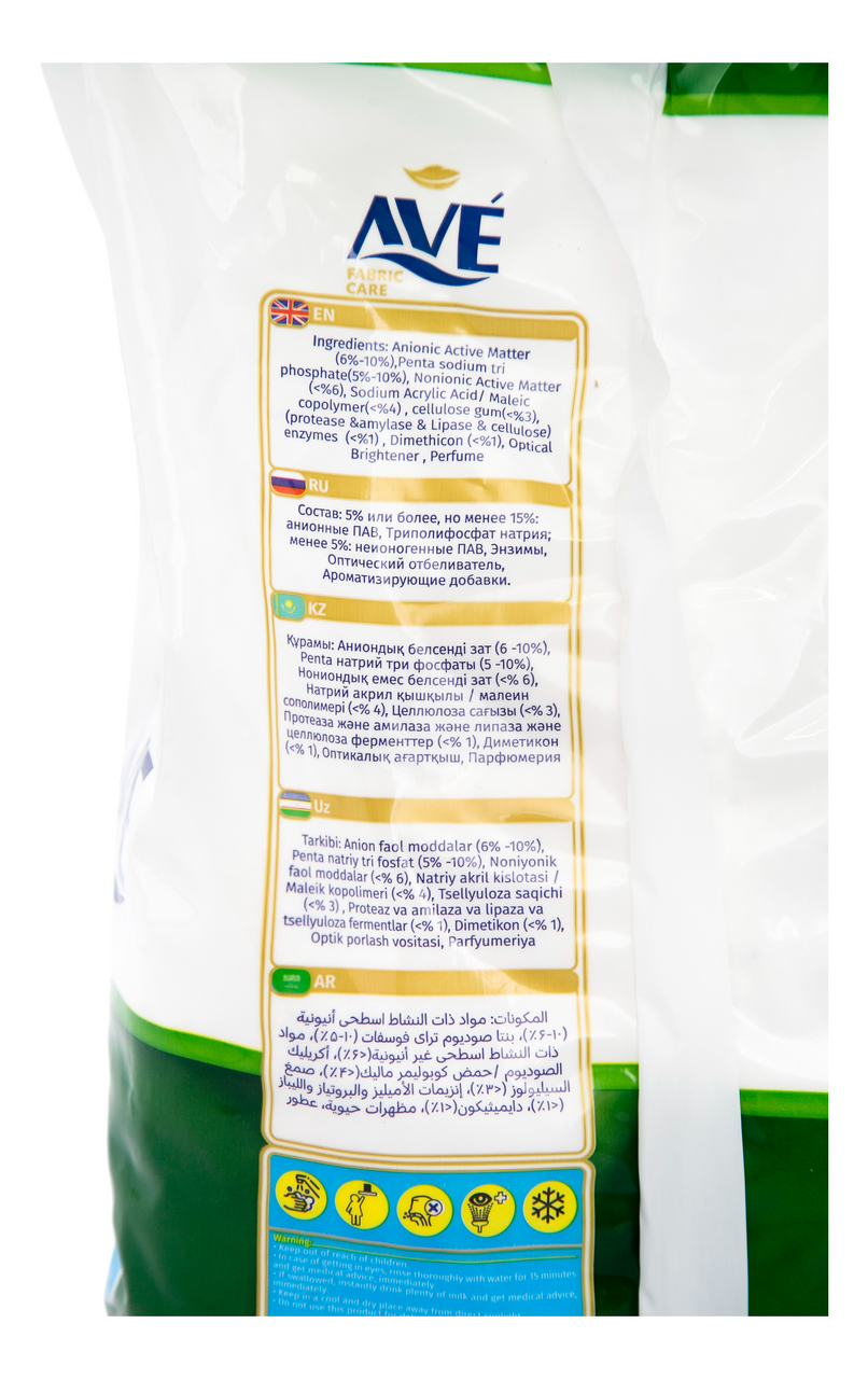Порошки Ave это прекрасный выбор для регулярного использования! Порошок производиться башенным методом. Быстро растворяется. Удаляет грязь и жир даже при стирке в холодной воде . В стиральном порошке содержание фосфатов менее 5 %. Это экологически чистый продукт. В составе порошков до 8 энзимов, отвечающие за удаление загрязнений доже при низких температурах. Образует обильную пену, придаёт цветной одежде яркость. Улучшает мягкость ткани и препятствует выцветанию черной одежды. Удаляет загрязнения на поверхности, а также проникает глубоко в волокна ткани и вымывает въевшуюся грязь. Устраняет пятна и неприятные запахи.