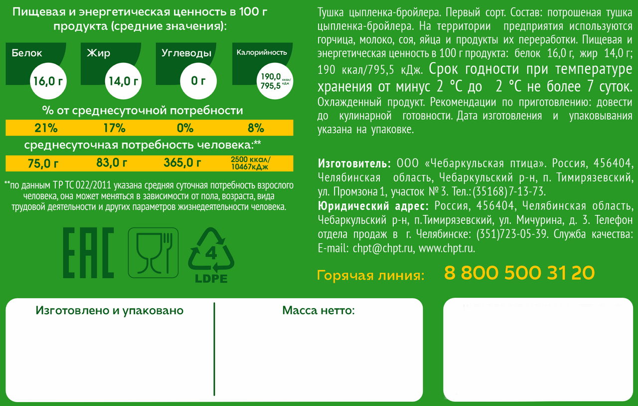 Тушка цыпленка-бройлера Чебаркульская птица охлажденная, ~1.5кг