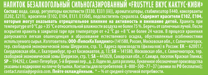 Напиток Frustyle газированный кактус-киви, 1.5л - газированный напиток с исключительно ярким вкусом. Он заряжает энергией, дарит отличное настроение и замечательно освежает. Попробуйте Фрустайл и ощутите вкус киви и кактуса, а также приятное покалывание миллионов пузырьков. Напиток подходит для употребления в течение дня. Также его используют для приготовления коктейлей. Перед подачей Фрустайл Кактус-Киви рекомендуют охладить.Это яркий экзотический кисло-пряный вкус газировки со необычными нотками в послевкусии. Этот лимонад прекрасно утоляет жажду и освежает в жаркий день. Насыщенный вкус дарит хорошее настроение. Попробуйте использовать его в коктейлях, дополняйте десерты газировкой или просто пейте охлажденным.