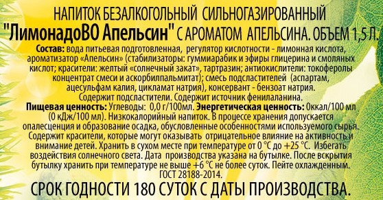 Вода питьевая подготовленная, регулятор кислотности – лимонная кислота, ароматизатор Апельсин (стабилизаторы: гуммиарабик и эфиры глицерина и смоляных кислот, красители: желтый солнечный закат, тартразин, антиокислители: токоферолы концентрат смеси и аскорбилпальмитат), смесь подсластителей (аспартам, ацесульфам калия, цикламат натрия), консервант – бензоат натрия.