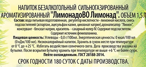 Вода питьевая подготовленная, регулятор кислотности – лимонная кислота, смесь подсластителей (аспартам, ацесульфам калия, цикламат натрия), консервант – бензоат натрия, ароматизатор Лимон, краситель – сахарный колер IV.
