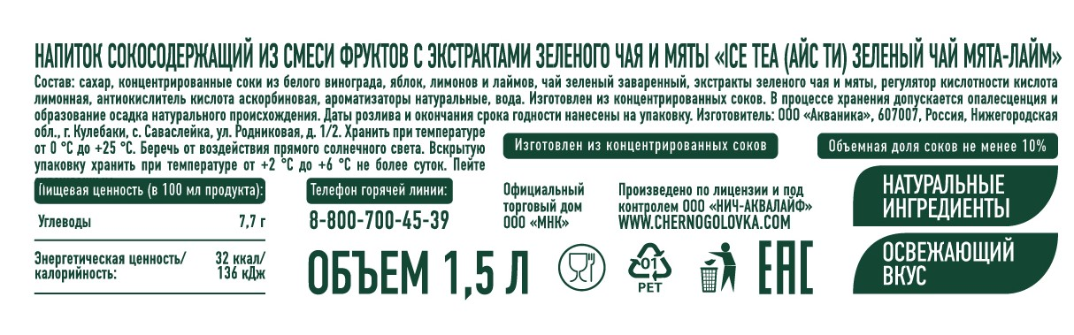 Холодный чай Черноголовка зеленый мята-лайм, 1.5л вкусный натуральный, освежающий, холодный чай, приготовленный на основе свежезаваренного зеленого чая и с ярким ароматом лайма и мяты. Такое сочетание даёт интересный и яркий вкус, который прекрасно освежает в самый жаркий день!