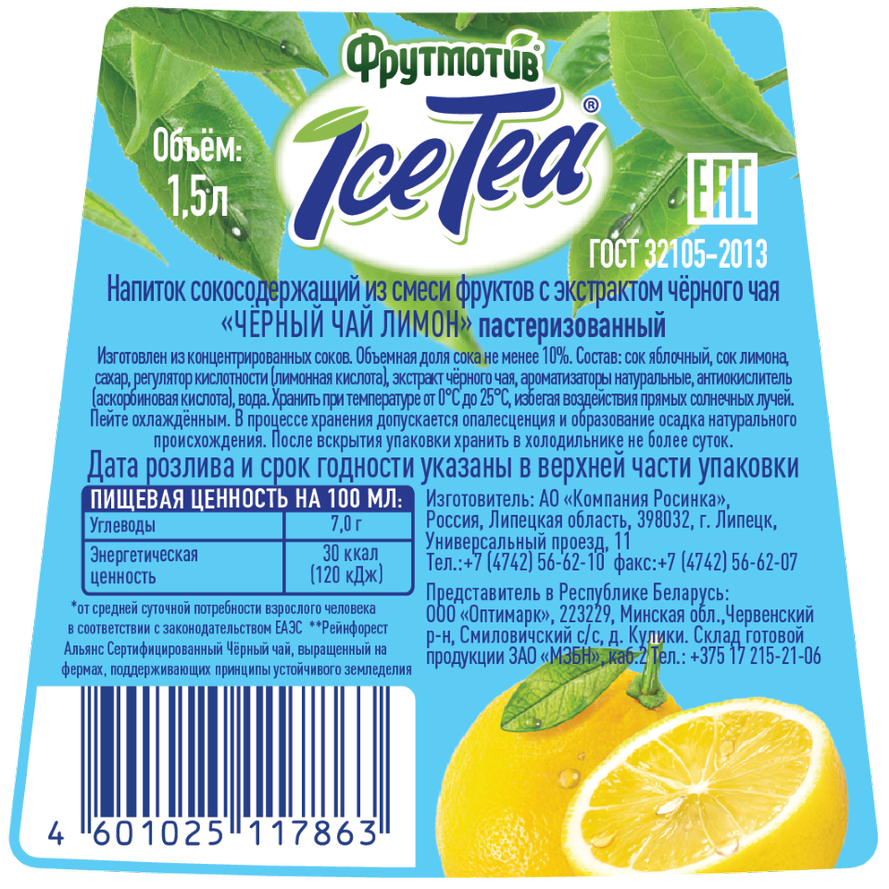 Сок яблочный, сок лимона, сахар, регулятор кислотности (лимонная кислота), экстракт чёрного чая, ароматизаторы натуральные, антиокислитель (аскорбиновая кислота), вода.