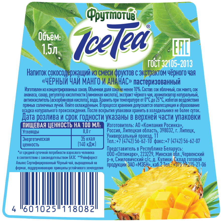 Чай черный холодный Фрутмотив манго-ананас, 1.5л - холодный черный чай со вкусом манго и ананаса, который отлично освежает жарким летним днем. Свежий, ароматный, он приготовлен из качественных ингредиентов. Напиток подходит для употребления людьми разного возраста.