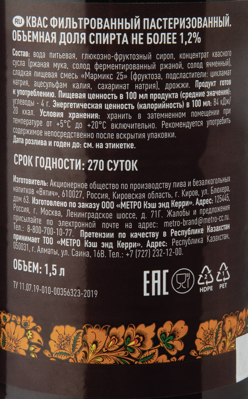 Традиционный русский напиток, пастеризованный фильтрованный квас дрожжевого брожения, созданный из натуральных ингредиентов без использования консервантов. Квас отлично освежит жарким днем, его можно употреблять в течение всего дня. Отличается легкой кислинкой. Представленная рецептура позволяет максимально раскрыть вкус кваса. За счет углекислоты, квас способствует более легкому перевариванию, всасыванию пищи и повышает ��ппетит. Также продукт содержит свободные аминокислоты, сахара и микроэлементы. Используется как прохладительный напиток. Хорошо подходит к окрошке.