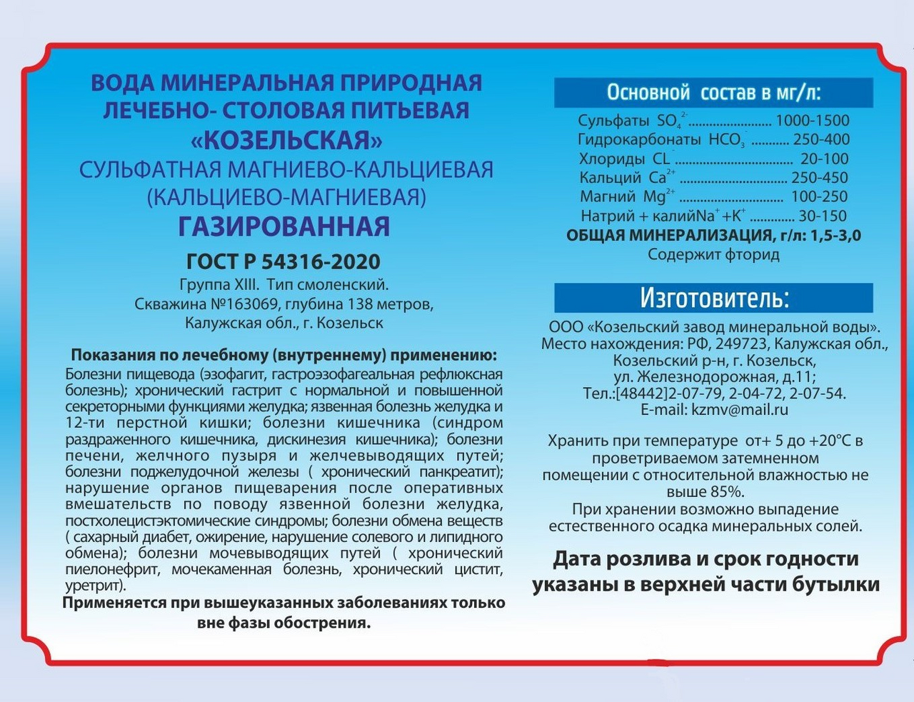 Вода минеральная природная лечебно-столовая питьевая Козельская сульфатная магниево-кальциевая, газированная.