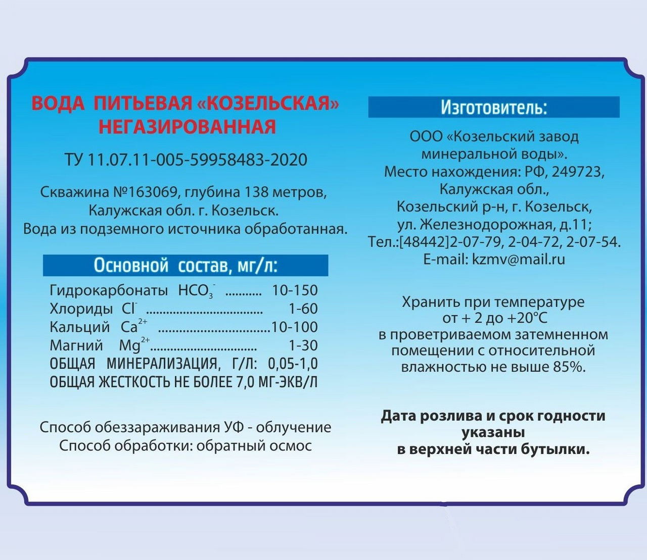Вода минеральная Козельская негазированная, 1.5л - природная артезианская питьевая первой категории. Рекомендована для ежедневного потребления. Производство расположено в черте города Козельска, имеющего давние исторические корни, в двух километрах от одного из духовных центров православия - монастыря Оптина пустынь. Артезианская скважина для добычи воды имеет глубину 138 метров и освящена иеромонахом Оптиной пустыни Филаретом.
