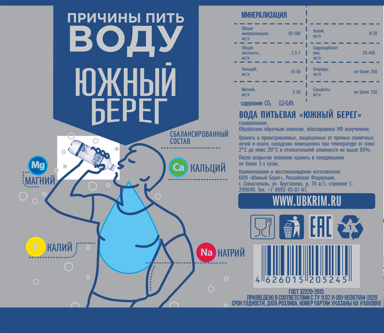 Вода Южный берег питьевая газированная, 1.5л обработана обратным осмосом, обеззаражена Уф излучением. Уникальная по своему происхождению и составу. На заводе вода проходит очистку на лучшем немецком оборудовании. Рекомендована к употреблению и взрослым, и детям. Поддержание водного баланса - простой способ заботы о своём здоровье.