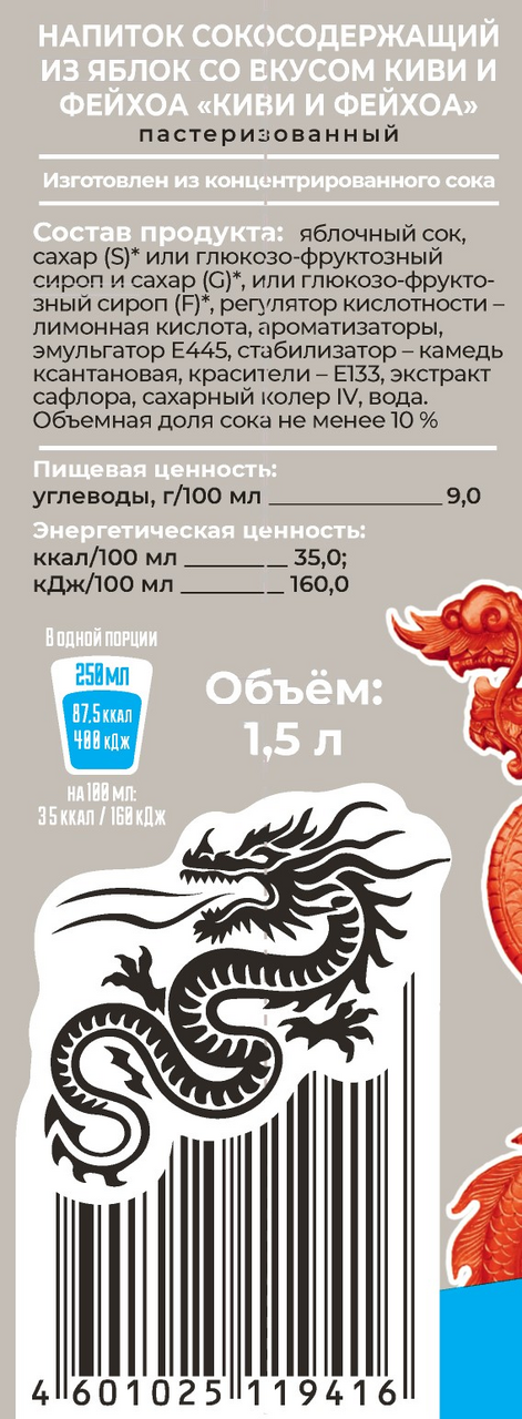 Напиток сокосодержащий Фрутмотив киви и фейхоа, 1.5л x 6 шт - откройте для себя уникальный вкус и пользу нашего напитка, сочетающего в себе свежие ноты киви и экзотический аромат фейхоа. Киви придает напитку нежную кисло-сладкую нотку, тогда как фейхоа добавляет утонченные тропические акценты. Вместе они создают гармоничное сочетание, которое порадует даже самых искушенных гурманов.