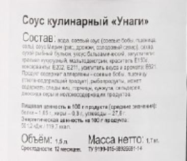 Вода, соус Мирин глюкозно-фруктозный сироп, вода питьевая, рис, сахар, соевый соус концентрированный соль, соевые бобы, пшеничная мука, вода, сахар, краситель Е150a, усилители вкуса и аромата: Е621, Е627, Е631, загустители.