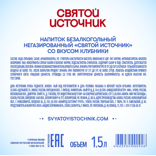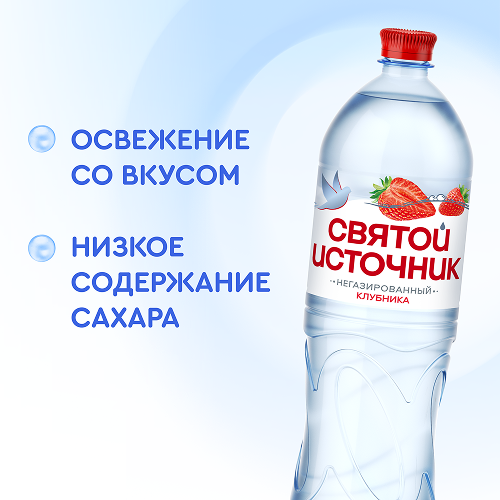 Вода Святой Источник негазированная клубника, 1.5л x 6шт - это безалкогольный негазированный напиток с освежающим ягодным вкусом. Производится на основе природной воды, рожденной в артезианских глубинах и очищенной с применением современных, щадящих методов. Вкус спелой клубники, низкое содержание сахара и отсутствие красителей – этот напиток послужит достойной заменой привычной газировки и идеально впишется в рацион приверженцев здорового питания. Формат удобен для поездки на дачу, на рыбалку, на пикник, а также для семейного потребления.