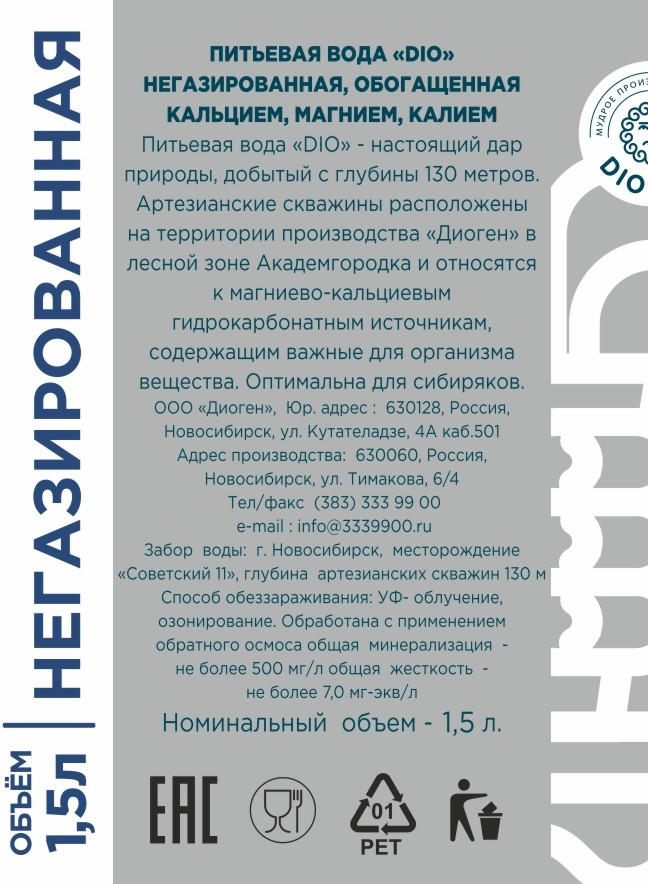 Проходит многоуровневую очистку природного напитка, добиваясь идеального баланса в составе минеральных и органических веществ. Этот источник относится к магниево-кальциевым гидрокарбонатным, содержащим важные для организма вещества. Питьевая вода DIO идеально подходит для ежедневного питья и взрослым, и детям. В ее составе - 16 важнейших для человека микро и макроминералов (главная характеристика качества, вкуса и п��лезности воды). DIO производится на полностью автоматической линии производства, проходит постоянный контроль качества - каждые 30 минут вода исследуется сотрудниками лаборатории, каждая партия воды проверяется региональным центром Роспотребнадзора РФ. Имеет мягкий и нежный вкус. Раскрывает истинный вкус чая и кофе, улучшает вкус первых блюд.