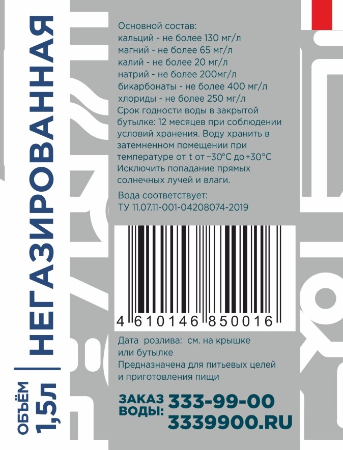 Содержание основных ионов мг/л: кальций < 80, магний <20, калий <20, гидрокарбонаты <250, хлориды <150, сульфаты <50. Общая жесткость < 6 мг экв/л.