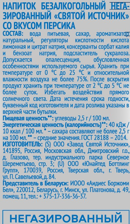 Вода Святой Источник со вкусом персика без газа, 1.5л - освежающий негазированный лимонад на основе чистой воды из артезианских глубин со вкусом сочного персика. Фруктовое удовольствие – солнечный вкус в небольшой бутылочке, которую удобно можно брать с собой куда угодно. Напиток сочетается с любимыми блюдами и отлично подойдет для ежедневного потребления. Пейте охлажденным.