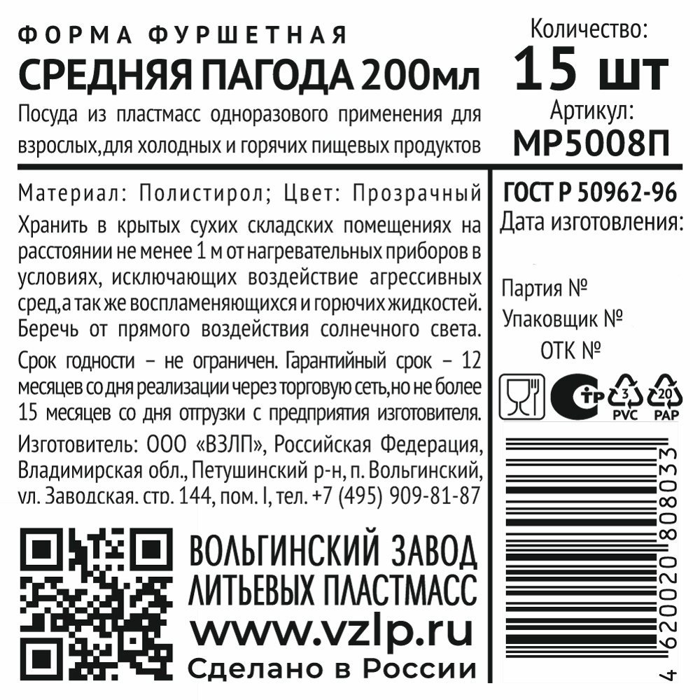 Форма для фуршета средняя Пагода 200 мл предназначена для подачи десертов, салатов, закусок и др. Объём формы рассчитан на одну порцию готового блюда. Отвечает всем санитарное – гигиеническим нормам и требованиям, имеет соответствующую маркировку и определенные знаки, по которым легко можно определить материал, а также вид утилизации данного товара. Может использоваться на банкетах, фуршетах, пикниках, для выездного питания, кейтеринга. Легкая и компактная чашка украсит любое торжество. Используется в кафе, ресторанах, кондитерских и других заведениях общественного питания для подачи десертов, мороженого, салатов, соусов, джемов, сухих закусок. Замечательно подходит для подачи трафило в стаканчиках. Желательно использовать в температурном диапазоне от -10С до +70С. При сильном нагревании, выше 85С деформируется.