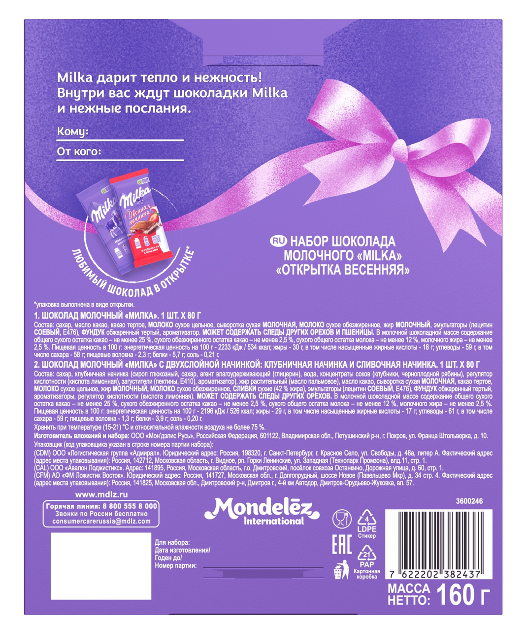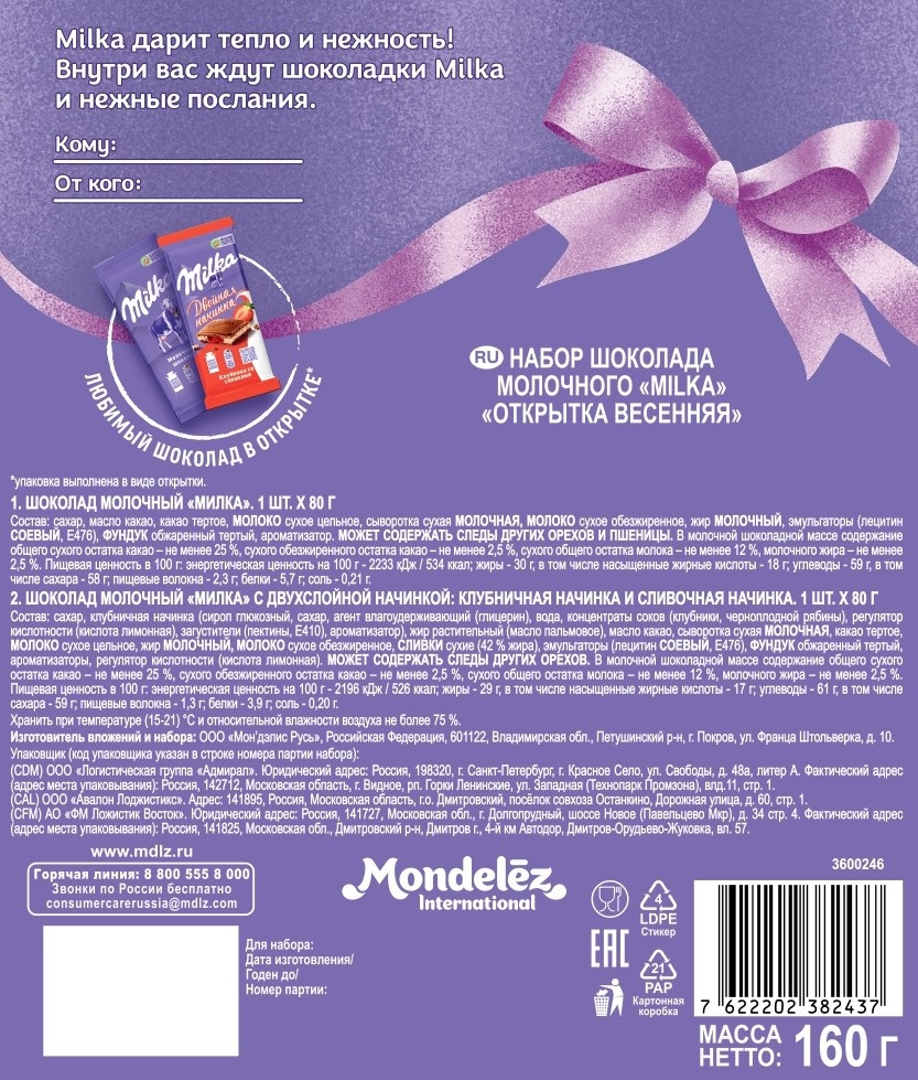 Набор шоколада молочного Milka Открытка весенняя, 160г