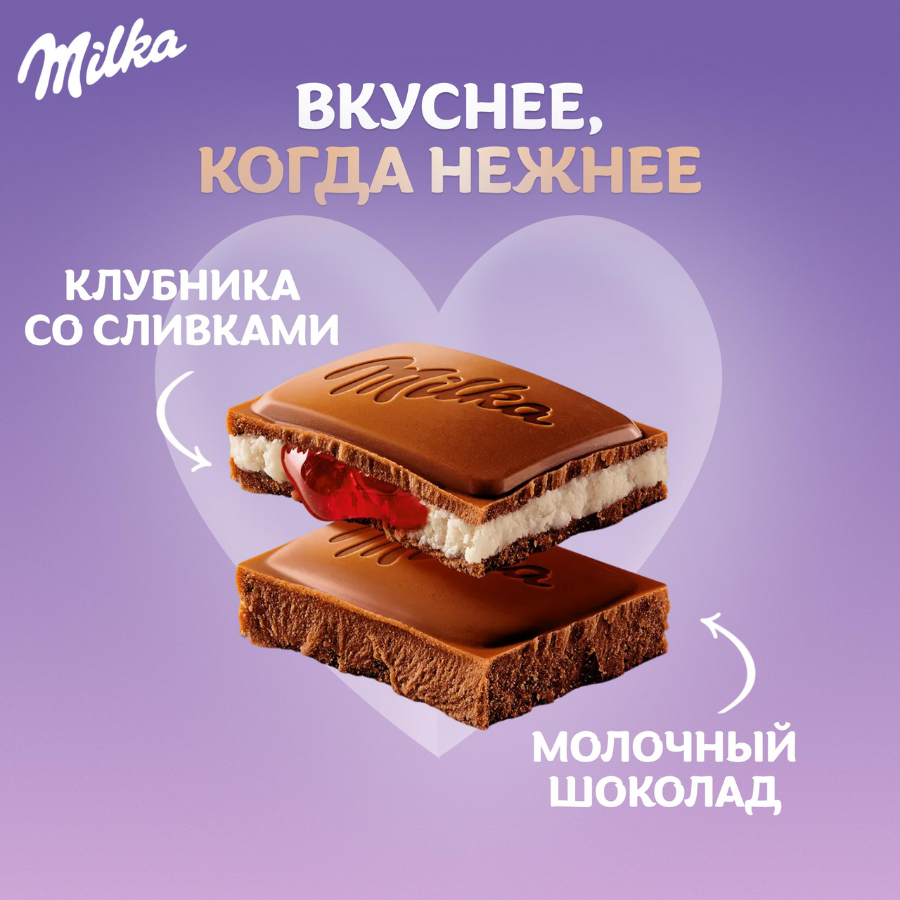 Шоколад молочный Милка: сахар, масло какао, какао тертое, молоко сухое цельное, сыворотка сухая молочная, молоко сухое обезжиренное, жир молочный, эмульгаторы лецитин соевый, E476, фундук обжаренный тертый, ароматизатор. Шоколад молочный Милка с двухслойной начинкой: клубничная начинка и сливочная начинка: сахар, клубничная начинка сироп глюкозный, сахар, агент влагоудерживающий глицерин, вода, концентраты соков клубники, черноплодной рябины, регулятор кислотности кислота лимонная, загустители пектины, E410, ароматизатор, жир растительный масло пальмовое, масло какао, сыворотка сухая молочная, какао тертое, молоко сухое цельное, жир молочный, молоко сухое обезжиренное, сливки сухие, эмульгаторы лецитин соевый, Е476, фундук обжаренный тертый, ароматизаторы, регулятор кислотности кислота лимонная.