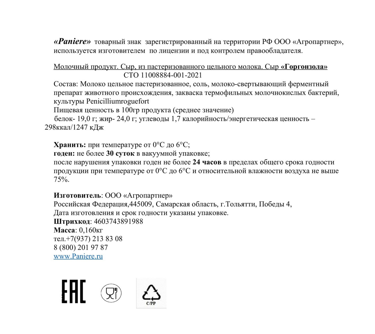 Пастеризованное цельное молоко, соль, молокосвертывающий ферментный препарат животного происхождения, закваска термофильных молочнокислых бактерий, культуры Penicilliumrogueforti.