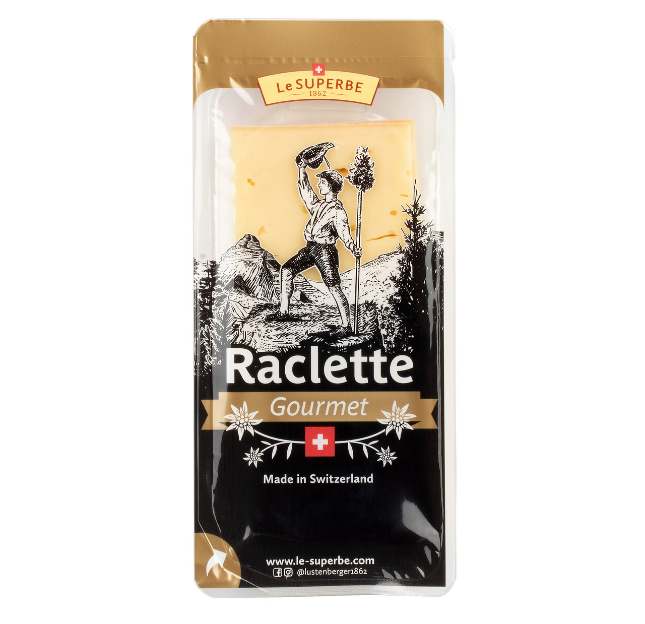 Сыр Raclette премиум-класса не только нежный и тающий, но и обладающий тонким запахом костра и приятной сладостью. Идеально подходит для приготовления швейцарского национального блюда Раклет с плавленым сыром. Большие куски сыра ставят возле огня или на специальной электрической раклетнице, и плавящийся сыр каждый из присутствующих за трапезой соскребает специальным ножом себе на тарелку, чтобы съесть его с печеной картошкой, маринованными огурцами и луком. Традиционно Раклет подают с белым вином сорта Фендан, которое также делают в кантоне Вале. Период созревания - 5 месяцев. Залогом успеха компании Lustenberger & Durst является идеальное сочетание происхождения, натуральности, традиций и инноваций. Свежее и натуральное молоко перерабатывается на местных сыроварнях вручную по рецептам, передаваемым из поколения в поколение. Изысканный продукт премиум-класса, обладающий приятным вкусом с легкими сладкими нотками и нежной текстурой. Раклет прекрасно подходит для приготовления швейцарского национального блюда с одноименным названием. В давние времена альпийские пастухи клали недалеко от костра головку сыра, чтобы он медленно плавился. Теплую и питательную массу они соскребали ножами и намазывали на хлеб. В наше время нет необходимости разводить огонь, ведь в продаже появились специальные приспособления – электрические раклетницы, позволяющие в любое время насладиться кулинарным шедевром. Блюдо раклет принято подавать с отварным картофелем, маринованными огурчиками и ветчиной. Сыр нарезан аккуратными тонкими ломтиками и упакован под вакуумом.