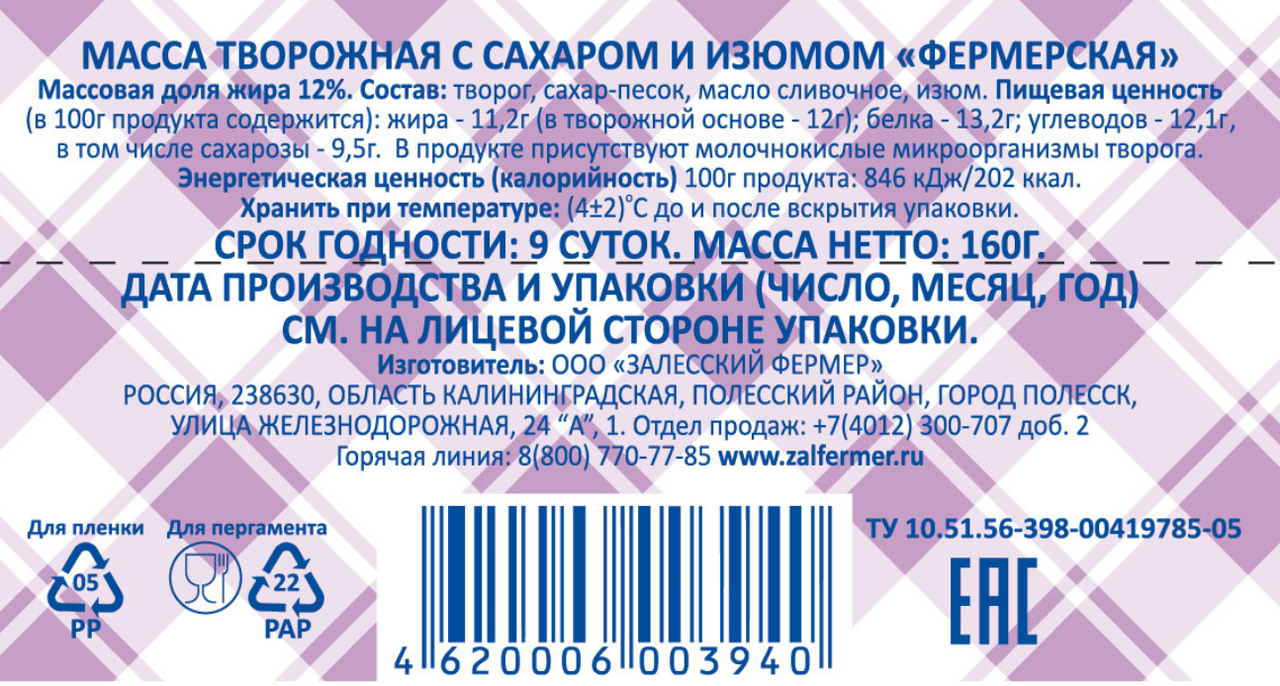 Масса творожная Залесский фермер с изюмом 12%, 160г