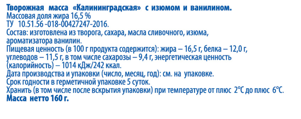 Творожная масса Добрая кормилица с изюмом 16.5%, 160г – полезный молочный продукт, который понравится детям и взрослым. Он изготовлен из отборного творога, полученного путем сквашивания нормализованного молока при помощи специальной закваски, содержит сахар, сливочное масло, изюм и ванилин в качестве ароматизатора. Масса обладает плотной и нежной однородной консистенцией, в которой отсутствуют крупинки и комочки. Подчеркнуть насыщенный вкус творога помогает приятная кислинка, которой обладает добавленный в продукт изюм. Творожная масса хорошо насыщает и утоляет голод, позволяет быстро пополнить запас сил и энергии. Она легко усваивается, не вызывая неприятного чувства тяжести в желудке. Продукт не содержит заменителей молочных жиров и обладает богатым составом. Он содержит кальций, натрий, фтор, магний, калий, железо, витамины из группы В, Е, С, аминокислоты и другие незаменимые для здоровья компоненты. При включении творожной массы в регулярное меню она помогает снизить уровень плохого холестерина, укрепляет кости и зубы, положительно сказывается на состоянии кожи и волос, снижает риск развития болезней серд��а и сосудов, нормализует пищеварение, укрепляет иммунитет.