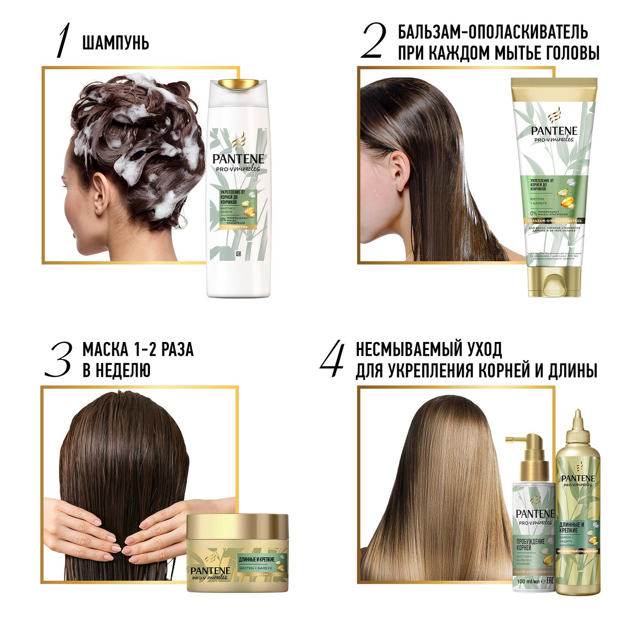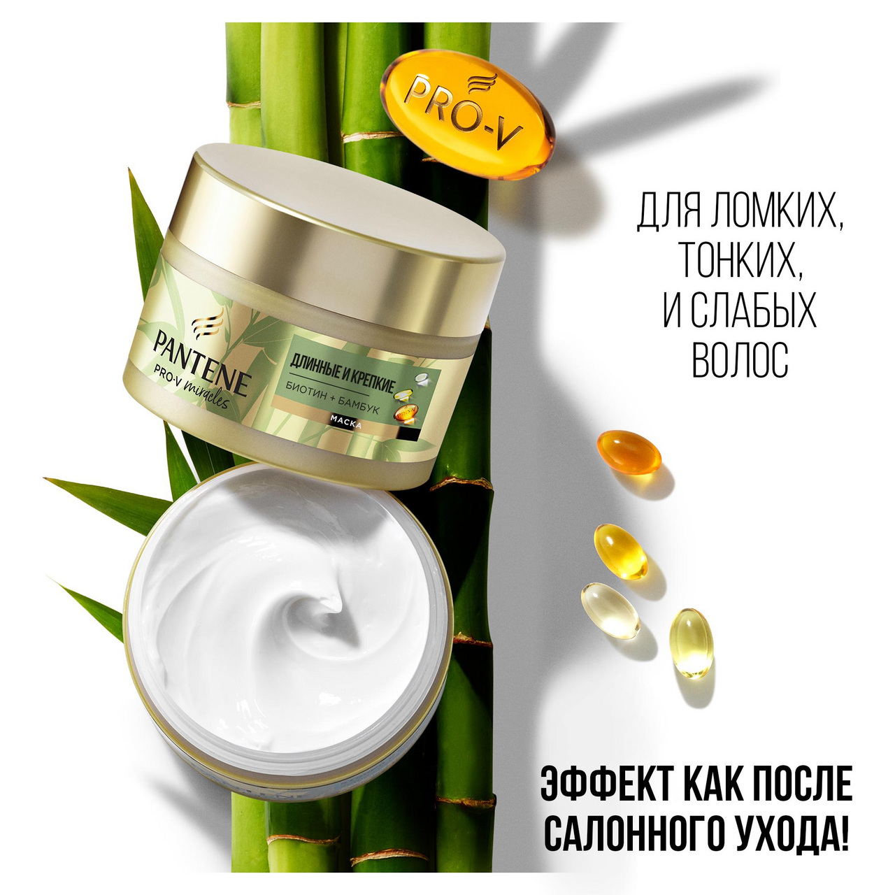 Это высокопитательная формула Pro-V для волос, которые нуждаются в чуде. Коллекция Укрепление от корней до кончиков, созданная специально для ломких, тонких и ослабленных волос, сочетает в себе силу комплекса Pro-V с экстрактом бамбука и биотином для силы, роста и густоты волос. Восстанавливающая маска для волос Рantene Pro-V Miracles Длинные и Крепкие с биотином и бамбуком делает волосы более сильными и помогает уменьшить выпадение волос, вызванное их ломкостью. Для достижения максимального эффекта используйте маску 1-2 раза в неделю и дополните уход бальзамом-ополаскивателем, кремом-реконструктором и средством для утолщения волос из серии Укрепление от корней до кончиков. Формула Pro-V протестирована специалистами Швейцарского Института Витаминов (Swiss Vitamin Institute).